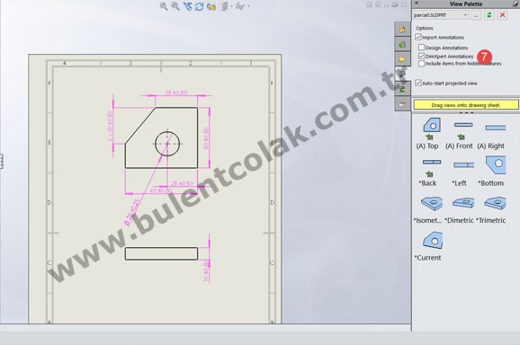7. Gerekli ayarlamalarımızı yaptıktan sonra, 1.metod da uyguladığımız gibi tasarımımızı teknik resim şablonumuza aktarıyoruz. ve “Dimexpert Annotations” seçeneğini işaretliyoruz.